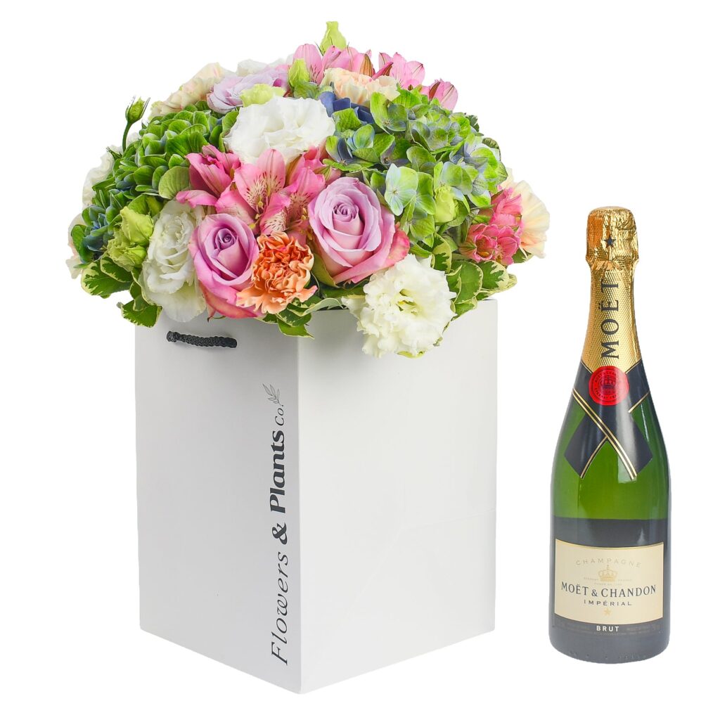 A vibrant bouquet featuring pink roses, lisianthus and our premium hydrangeas. Accompanied by a bottle of vintage champagne this is the perfect gift.