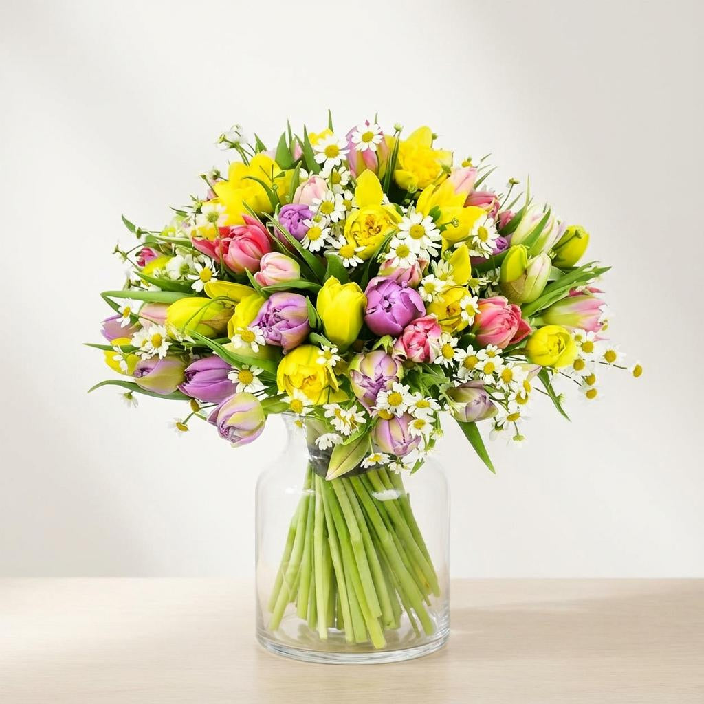 For anyone looking to bring a ray of sunshine into their life – this bouquet is the one. Mixed tulips are combined with fresh daisies for an up-beat, easy on the eye elegance.