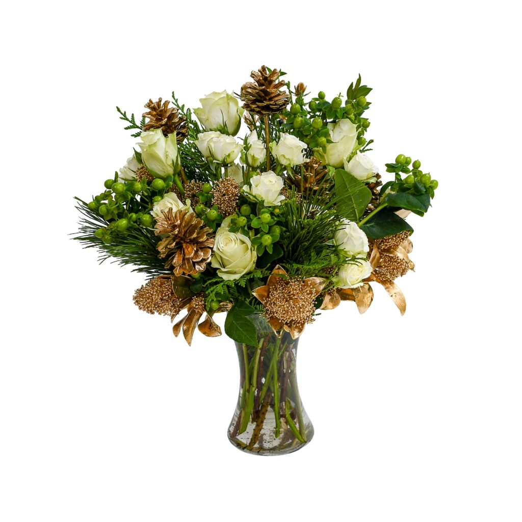 This timeless white-and-green arrangement is the perfect Christmas gift – elegant, classic, and guaranteed to bring joy to any home. Featuring luxurious white roses, skimmia, pinecones, and touches of hypericum,